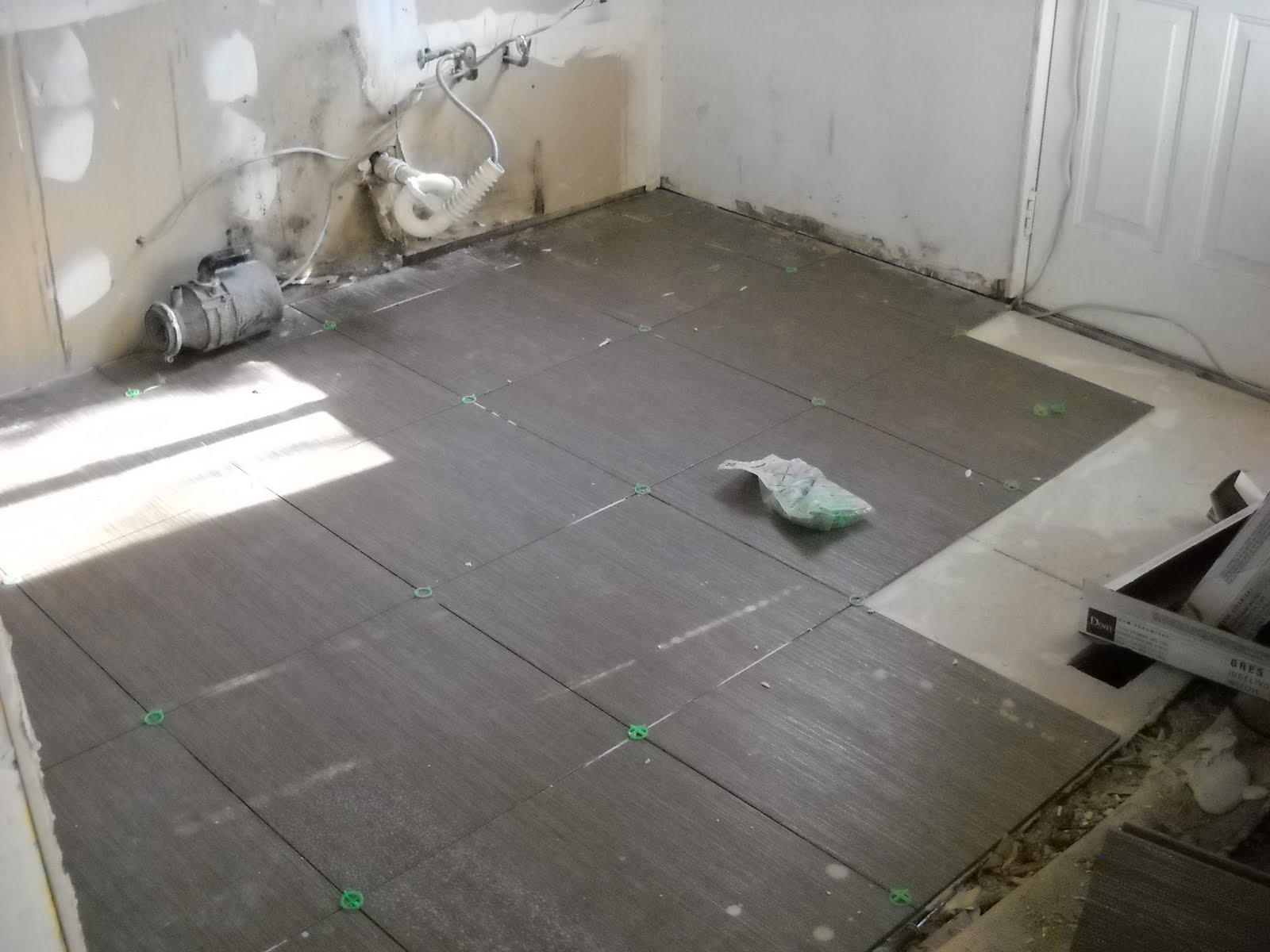 Here, the kitchen floors are installed. The floors are 18x18 imported Italian porcelain. Notice the door in the upper right of the photo. It has now been closed off to expand the kitchen space.